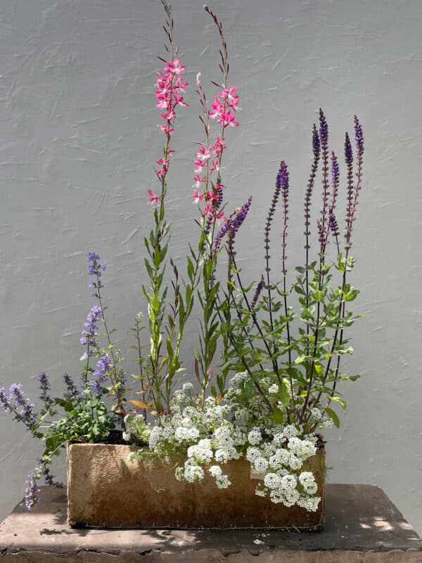Una bellissima sfumatura primaverile di colori: bianco, lilla, rosa e viola. Il delicato profumo di miele dell’Alysso, l’aromatico profumo della Salvia, il sapore della Nepeta.. rendono questo Prêt à planter un piacere per i sensi. In inverno si spengono i colori, rimangono i fiori bianchi dell’Alysso come fiocchi di neve da cui spuntano i fusti rossi della Gaura a portare l’atmosfera Natalizia.